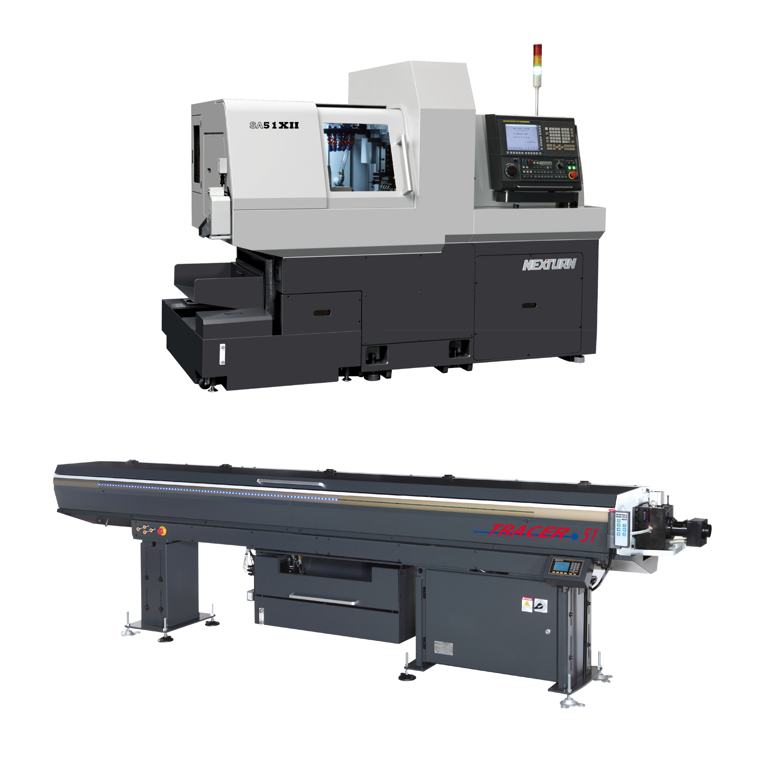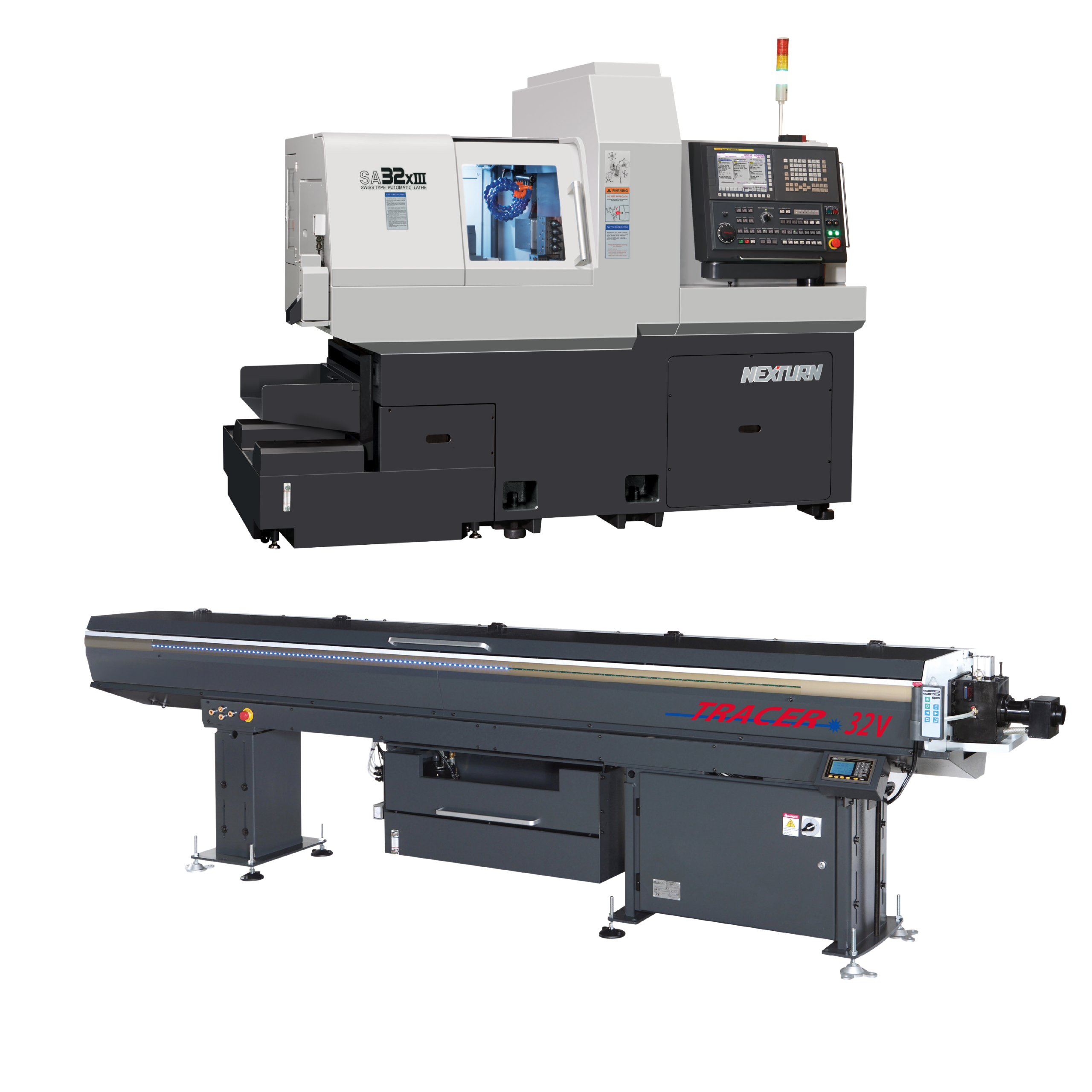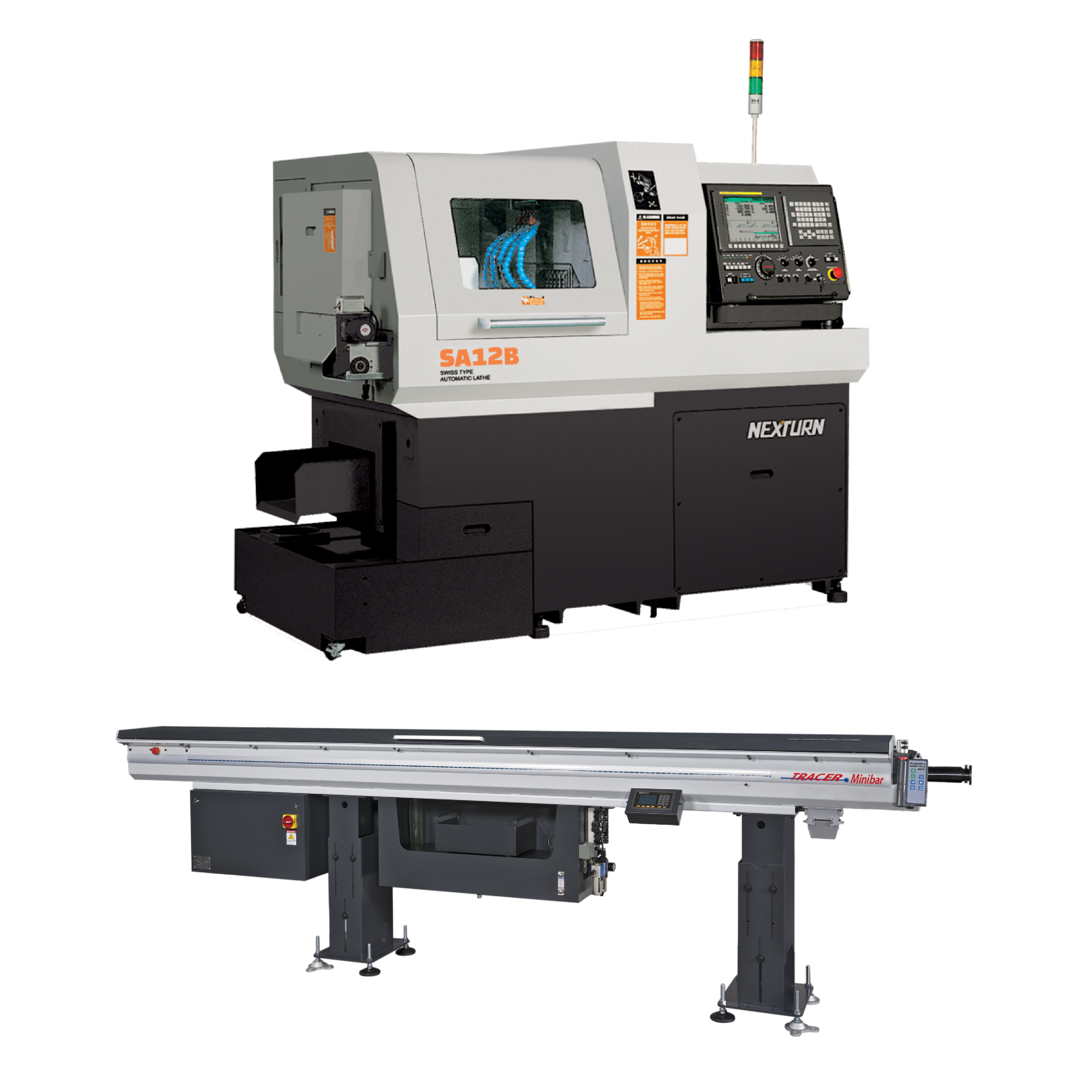 Is there a catch? The answer is NO. When you buy a Nexturn CNC Swiss lathe from Absolute Machine Tools, we will pair it with a new free TRACER hydrodynamic magazine bar feeder. This generous free bar feeder offer includes installation of the corresponding TRACER bar feeder in one incredible package price. For more information, scroll down to the Nexturn Swiss lathe you’re most interested in and see the matching FREE TRACER hydrodynamic magazine bar feeder that will be included with your order.